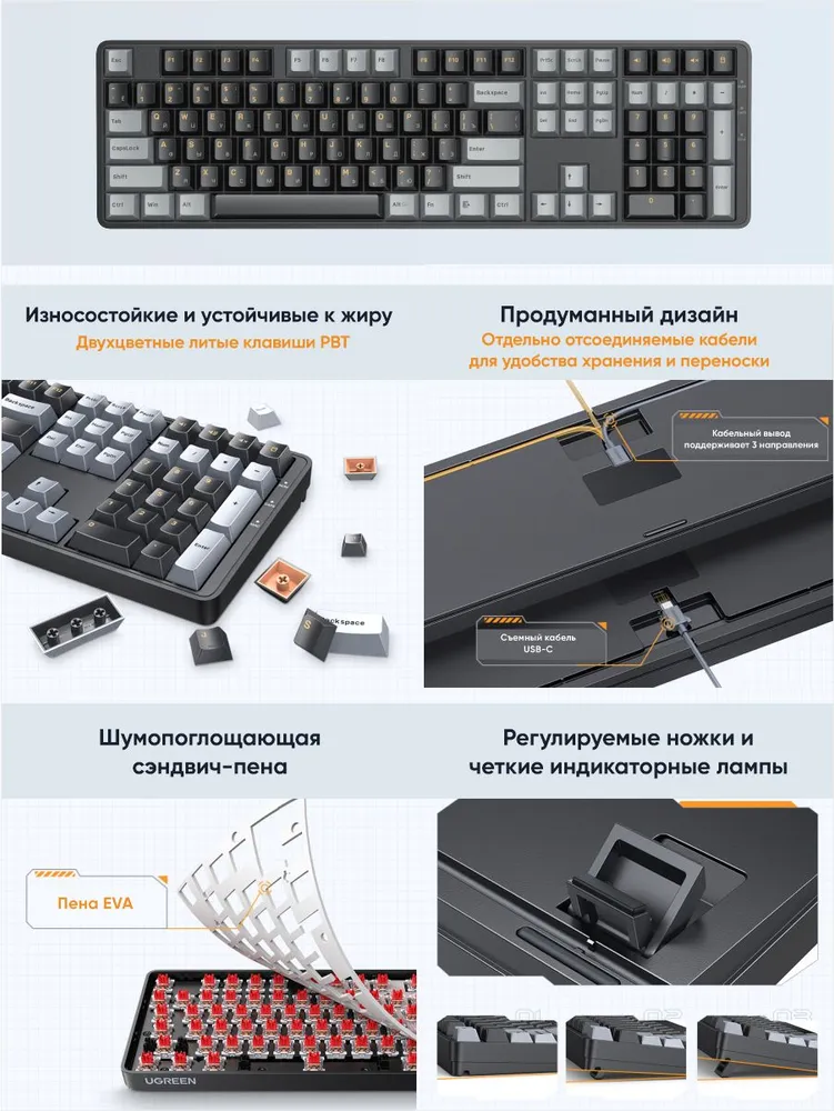35214 Клавиатура проводная механическая UGREEN KU103 USB Wired Mechanical Keyboard RU. Длина кабел