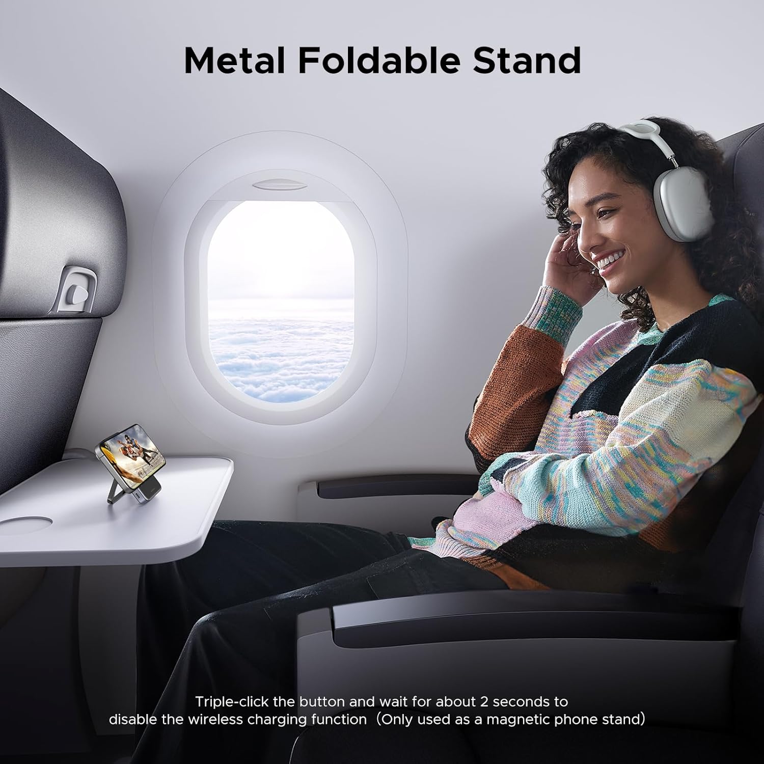Складная подставка: У портативного зарядного устройства есть складная металлическая подставка, похожая на ухо робота. Она надёжно удерживает телефон во время зарядки, освобождая руки — удобно смотреть видео или общаться в чатах.