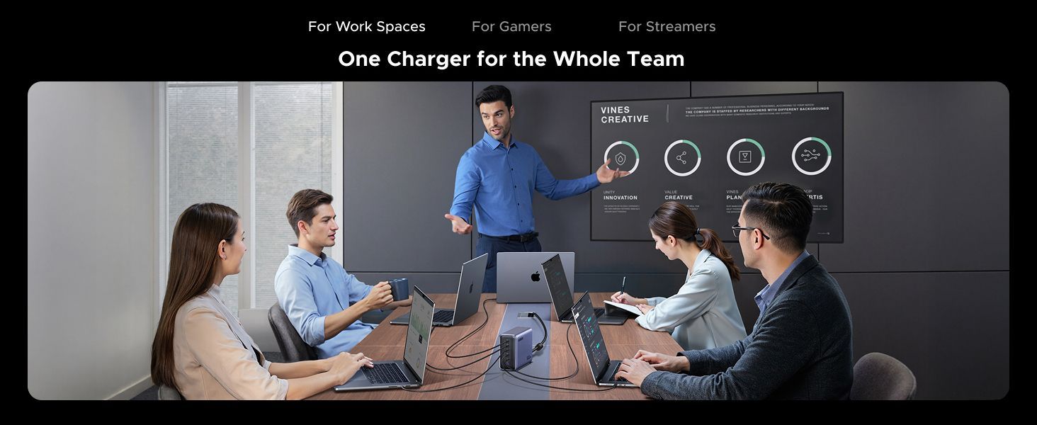 Универсальная зарядка для всех устройств разом: 6 портов (5×USB‑C, 1×USB‑A) позволяют быстро заряжать несколько гаджетов одновременно. То, что нужно в офисе или дома, где постоянно что‑то нужно подключить.